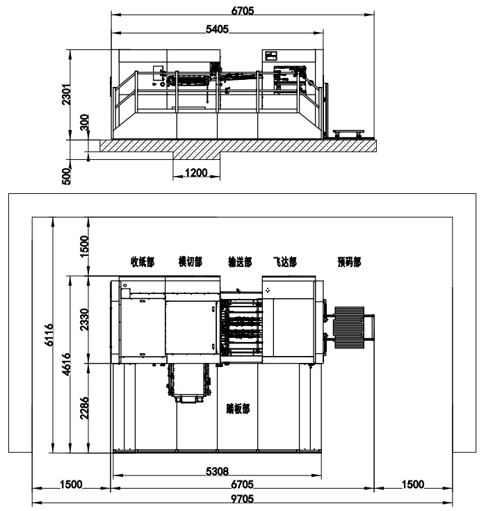 | 整機(jī)尺寸(含板框預(yù)裝架) | 6705×5516×2301mm(長含預(yù)上紙軌道;寬含腳踏板) |